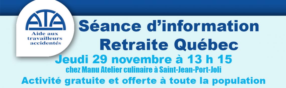 Afin de mieux comprendre le processus d’admissibilité, l’Aide aux Travailleurs Accidentés vous invite à une séance d’information sur Retraite Québec. Cette rencontre portera sur les rentes régulières et les rentes d’invalidité.