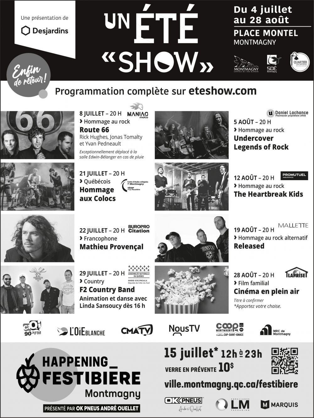 Une programmation festive et rassembleuse - La Société de développement économique de Montmagny (SDÉ) et ses partenaires ont dévoilé la programmation 2022 de spectacles extérieurs d’Un été « show » présentée par Desjardins. Il faut dire qu’après deux années de pause, le comité organisateur comme les festivaliers avaient bien hâte de renouer avec la place Montel et ses spectacles. Avec près d’une vingtaine de prestations artistiques présentées tout à fait gratuitement du 4 juillet au 28 août.